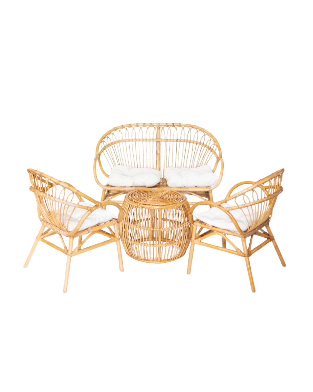 Cet ensemble en rotin est idéal pour créer un espace lounge chaleureux et convivial. Composé de deux fauteuils confortables, d’une banquette et d’une table basse assortie, il s’intègre parfaitement dans une ambiance naturelle, élégante et tendance.